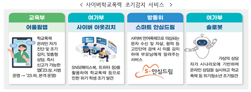 아울러, SNS 등을 통해 사이버폭력을 감지하는 어울림앱(교육부), 사이버 아웃리치(여가부), 스마트 안심드림(방통위), 솔로봇(여가부) 등 앱(App)을 홍보하고 학생들의 활용도를 높여 피해 의심 학생을 조기에 감지한다.