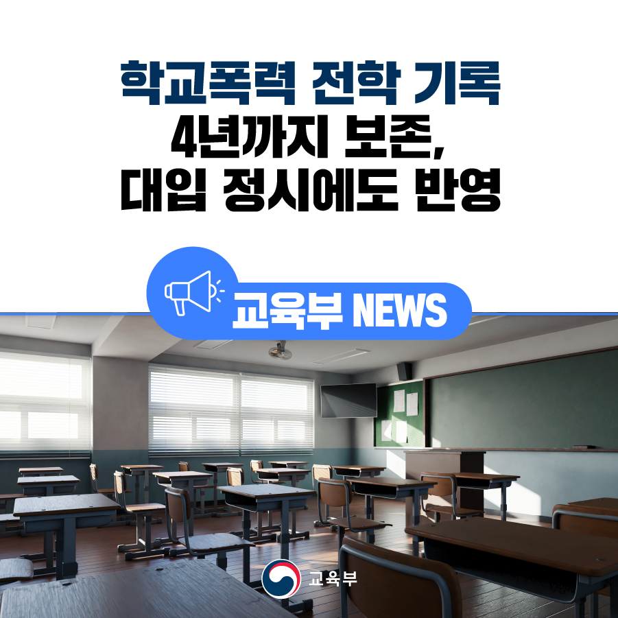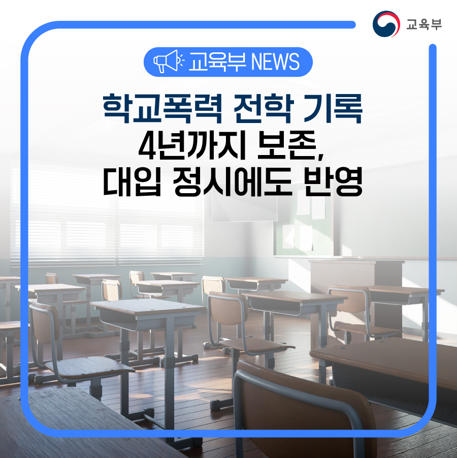 먼저, 중대한 학교폭력을 일으킨 가해학생에게 내려지는 출석정지(6호), 학급교체(7호), 전학(8호)의 학생부 기록 보존기간을 졸업 후 2년에서 4년으로 연장하여 ‘학교폭력시 대학 입학뿐만 아니라 졸업시까지도 불이익을 받는다’는 경각심을 강화한다.