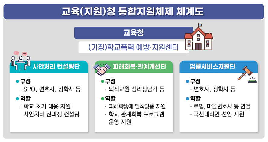 학교 현장에서 교사들이 적극적으로 학교폭력 사안에 대응할 수 있도록 17개 시도교육청에 ‘(가칭)학교폭력예방·지원센터’를 설치·운영한다. 센터는 학교 현장의 사안 처리, 가·피해학생 간 관계회복, 법률서비스 등을 지원한다.