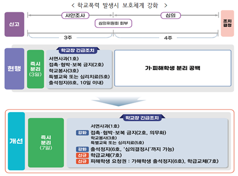 학교폭력이 발생하면 학교장은 가·피해학생을 즉시분리를 실시하는데, 현행 3일로는 휴일이 포함된 경우 실효성이 낮아(예 : 금요일 분리시 월요일 분리 해제) 그 기간을 ‘7일 이내’로 연장하고, 분리 이후에 학교장이 피해학생을 보호하기 위해 조치할 수 있는 ‘가해학생 대상 긴급조치’에 학급교체(7호)를 추가한다.