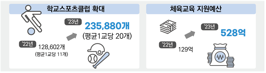 올해 하반기부터 시범학교와 늘봄학교 중에서 희망하는 학교에 대해 심리 안정 교육 프로그램을 운영하고, 2025년에 전국으로 확산해 나간다. 또한 학교스포츠클럽 운영을 대폭 확대하고 학생 예술동아리 지원도 확대하여 학생들의 공동체 역량과 감성을 높여 나간다.