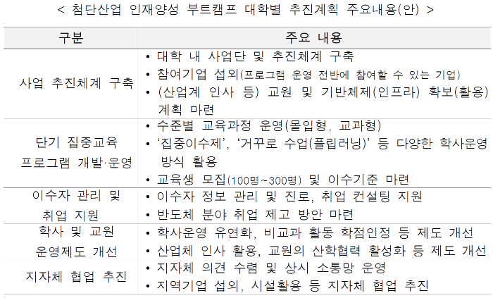 ‘첨단산업 인재양성 부트캠프’는 다양한 배경의 학생들이 대학과 기업이 공동 운영하는 1년 이내 집중교육을 통해 반도체 등 첨단분야 기업에 취업할 수 있도록 기획된 신규 사업이다. 올해 10개 대학(대학 5개교, 전문대학 5개교)을 선정하여 향후 5년간 사업 운영을 위한 총 150억 원의 재정지원을 하게 된다.