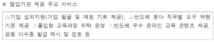 단기 집중교육 프로그램 이수자는 그 수준에 따라 기업·대학 공동명의의 소단위 학위(마이크로디그리) 이수증 등을 받아 이를 취업 등에 활용할 수 있게 된다. 이수 실적은 반도체 업계 취업 실적 등과 함께 사업 성과의 핵심지표로 지속해서 관리될 계획이다.