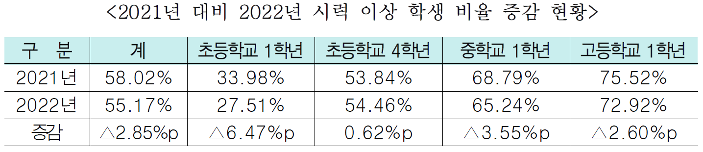 시력 이상* 학생 비율은 전체 55.17%로 2021년 58.02% 대비 2.85%p 감소하였고, 시력 이상자 중 교정 중인 학생 비율도 30.06%로 2021년 31.17% 대비 1.11%p 감소하였다.