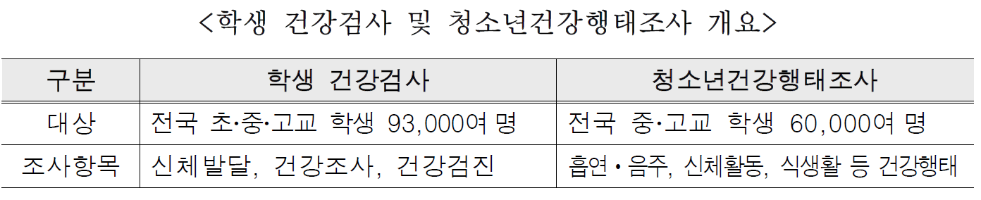 * 초‧중‧고 표본학교의 전 학년에 대한 신체발달 상황(92,693명) 및 건강조사(89,286명) 결과와 초 1‧4학년 및 중‧고 1학년(28,369명)에 대한 건강검진 결과 분석