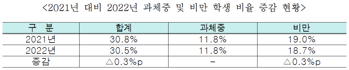 2021년 대비 과체중 학생의 비율은 변화가 없으나, 비만 학생 비율은 0.3%p 감소하였으며, 또 읍·면 지역의 과체중+비만 학생 비율이 도시 지역 학생 비율보다 상대적으로 컸다.