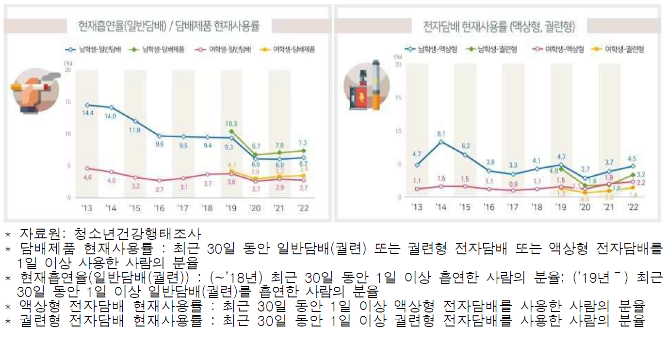 2022년 청소년(중1~고3) 흡연 행태는 2021년 결과와 큰 차이가 없었지만, 코로나19 유행 이후 개선되었던 음주 행태는 나빠졌다. 현재 흡연율(일반담배(궐련))은 2022년 결과 남학생 6.2%, 여학생 2.7%로 2021년과 유사하였으며, 전자담배* 현재 사용률은 증가하였다.