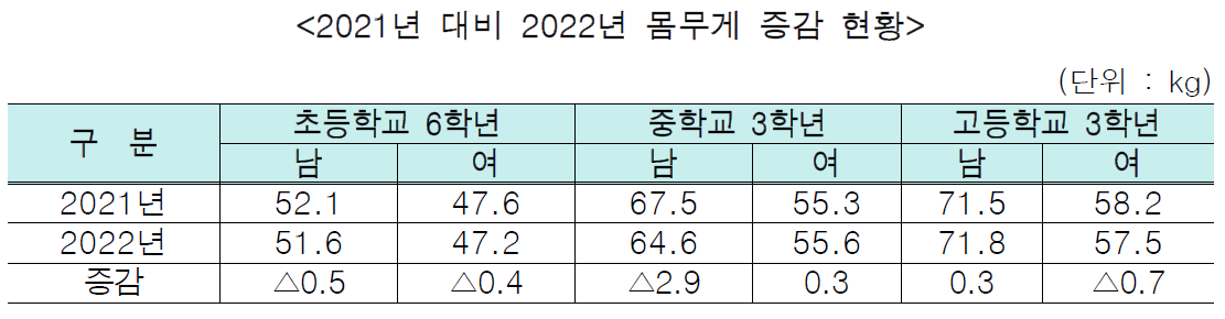 몸무게는 2021년 대비 큰 변화는 없었으나, 초등학교 6학년 남·여학생과 고등학교 3학년 여학생의 경우 키가 커졌으나, 몸무게는 0.4~0.7kg 감소하였다.