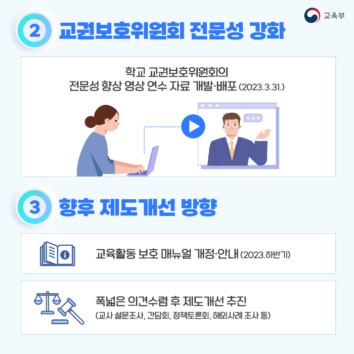 - 학교 교권보호위원회의 전문성 향상 영상 연수 자료 개발·배포(2023.3.31.)