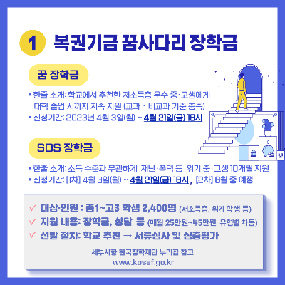 복권기금 꿈사다리 장학금은 역량과 잠재력을 갖춘 저소득층 우수 중·고등학생을 선발하여 대학까지 연계 지원하는 국가 장학사업으로 학생의 꿈과 역량, 지원 필요성 등에 따라 꿈 장학금과 S0S장학금 2가지 유형으로 운영됩니다.