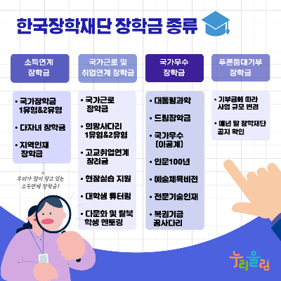 여러분이 많이 알고 계시는 국가장학금인 소득 연계 장학금과 국가 근로 장학금 외에도 다양한 장학금이 있다는 사실! 알고 계신가요? 오늘은 대학생뿐만 아니라 중·고등학생 장학금 및 지원 사업을 소개하겠습니다.