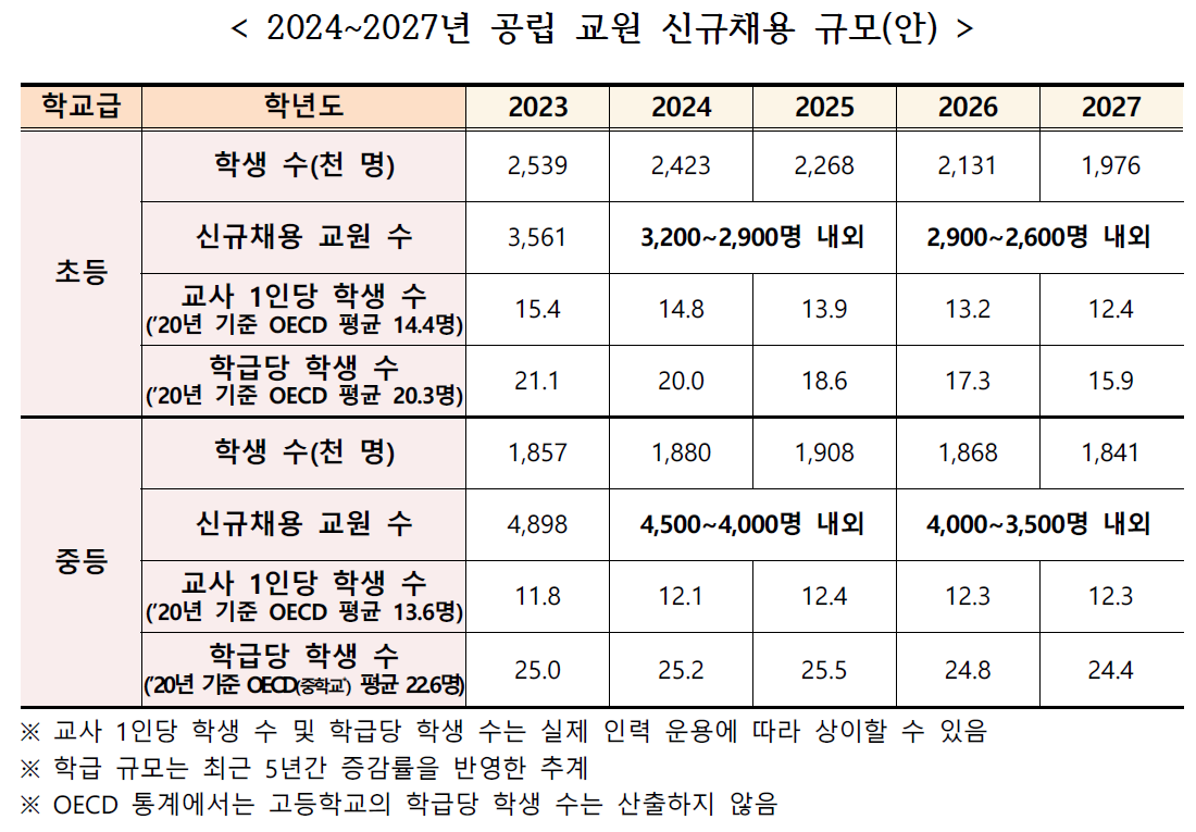 ⑤ 학령인구 감소 추세 및 새로운 교육수요를 반영한 중장기 교원수급계획에 따라 2024년 교사 신규채용은 초등 3,200명 내외, 중등 4,500명 내외로 선발할 예정이며, 향후 시도교육청별 퇴직 현황 등 인력운용 상황을 고려하여 매년 시도교육청과 협의를 통해 연차적으로 규모를 조정해 나갈 계획이다.