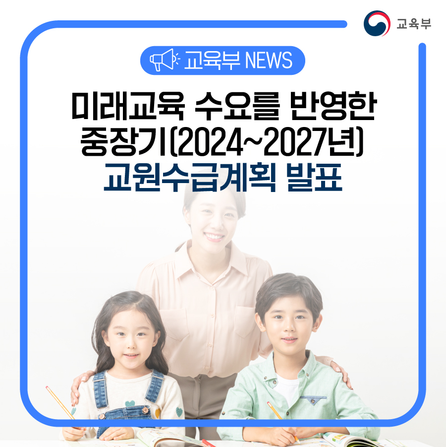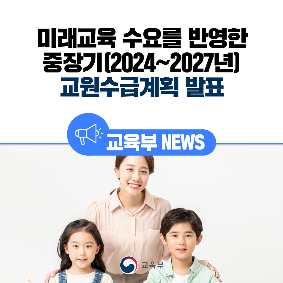 교육부(부총리 겸 교육부장관 이주호)는 학령인구 급감, 디지털 대전환 등 미래 교육환경 변화에 대응하여 모두를 위한 맞춤교육을 강화하기 위해 「중장기(2024~2027년) 초‧중등 교과 교원수급계획」을 발표한다.