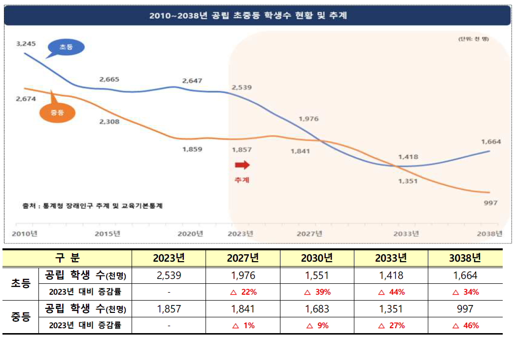 ① 2021년 통계청 장래인구추계에 따르면 공립 초‧중등 학생 수는 2023년 대비 2027년까지 약 58만 명(약 13%)이 감소하고, 이후 감소 폭이 확대되어 2038년까지 초등 약 88만 명(약 34%), 중등 약 86만 명(약 46%)이 감소할 것으로 예상되며, 이번 교원수급계획은 학령인구 감소 충격을 최소화하기 위해 이러한 변동 추이를 분산하여 반영하였다.