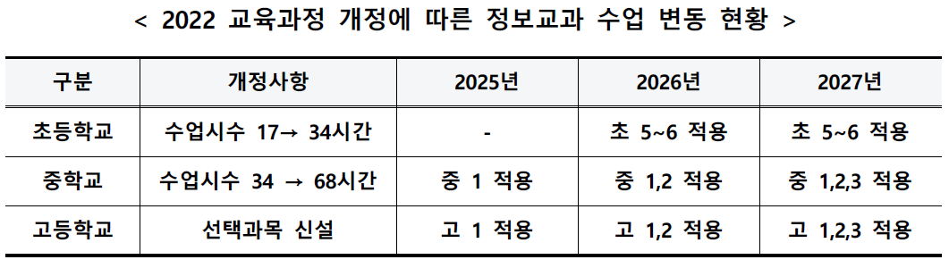 이에 따라, 모든 중‧고등학교에 최소 1명의 정보교과 교원을 배치하고, 일정 규모 이상 초등학교에도 정보 교과전담교원이 배치되도록 지원한다.