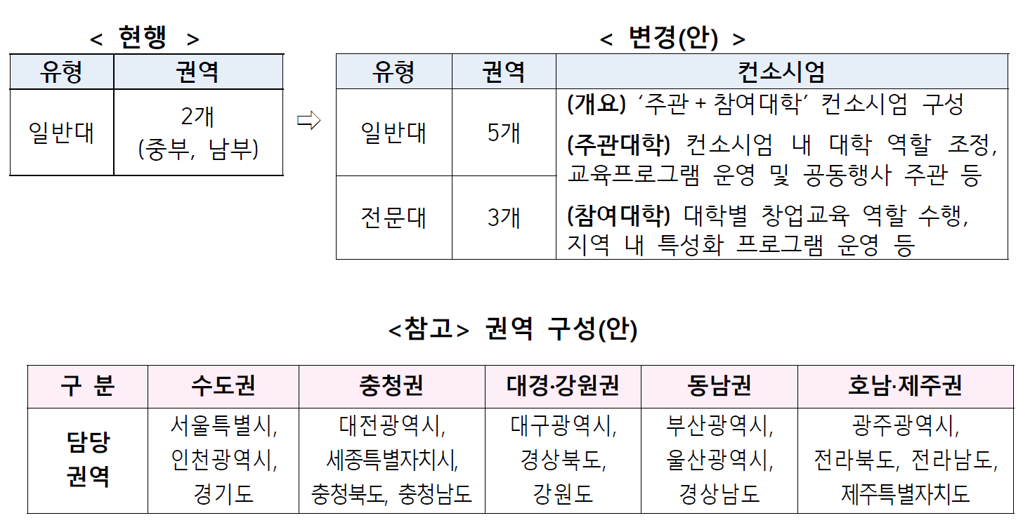 올해부터는 대학 간·지역 간 창업교육 격차를 해소하고 지자체 등 지역 창업 주체와의 연계를 강화하기 위해 기존 2개 권역으로 운영되었던 창업교육 거점대학을 5개 권역으로 확대·개편하여 총 8개 연합체(컨소시엄, 일반대 5개, 전문대 3개)를 선정한다. 또한 사회진출이 빠른 전문대의 특성을 고려해, 전문대 유형을 신설하여 전문대 특성화 분야별 실전형 창업교육 프로그램 및 마케팅·시제품 제작 능력 중심의 교육과정 개발을 지원할 예정이다.