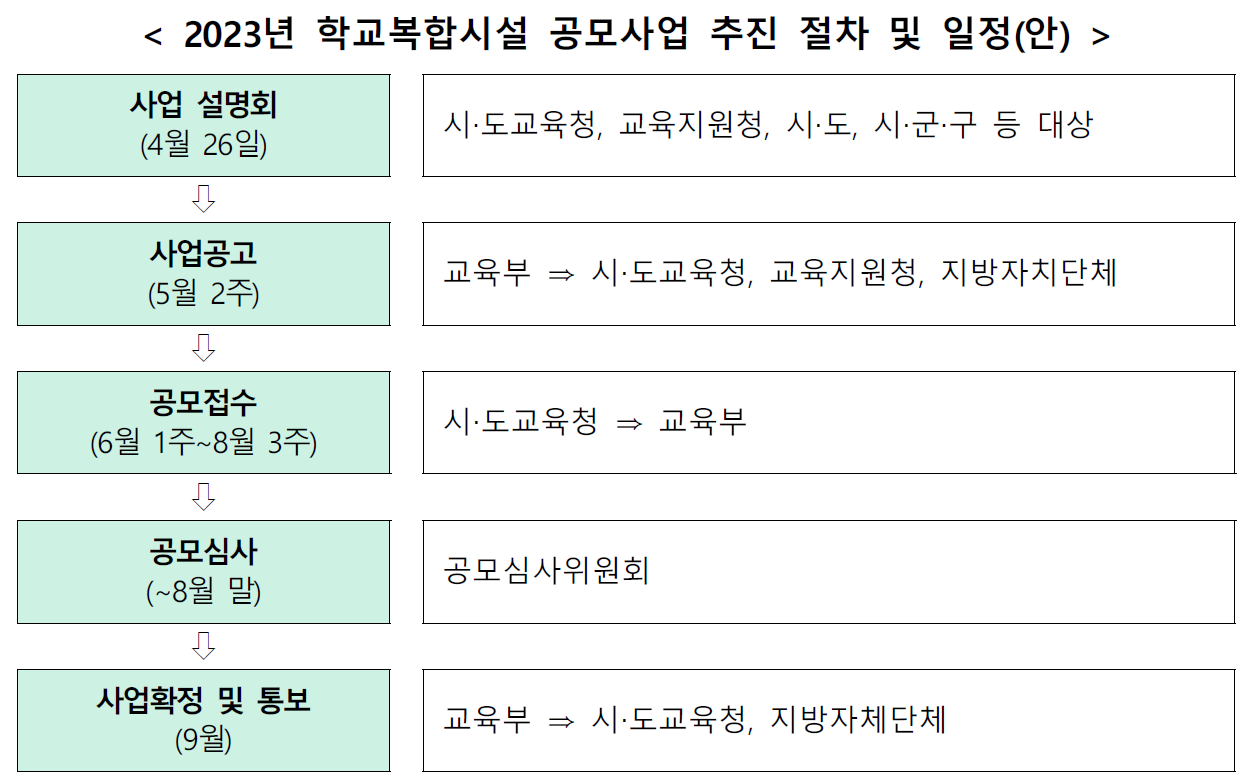교육부(부총리 겸 교육부장관 이주호)는 4월 26일(수), 서울 엘타워에서 전국 시도교육청 및 지방자치단체 등을 대상으로 2023년 학교복합시설 공모사업 설명회를 실시한다.