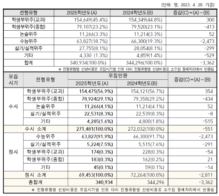 전체 모집인원은 학령인구 감소에 따른 대학 자체 구조조정 등으로 2024학년도보다 3,362명 감소한 340,934명