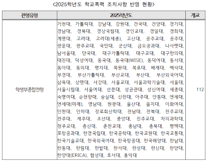- 학생부종합전형 학교폭력 조치사항 반영 대학 112개교