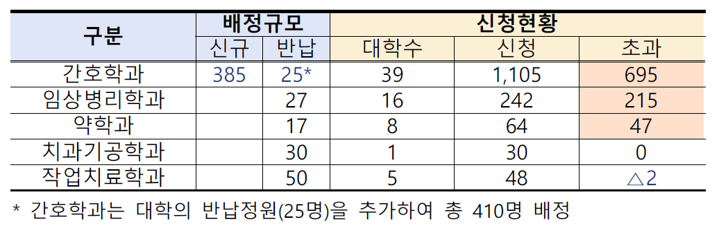 - (보건의료 분야) 간호학과 410명 등 5개 보건‧의료 학과에 532명 배정 (간호정원 : 수도권 39명, 비수도권 371명)