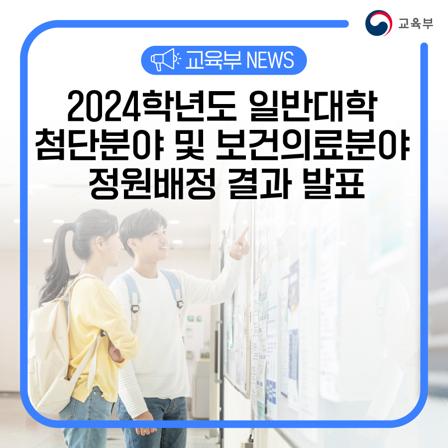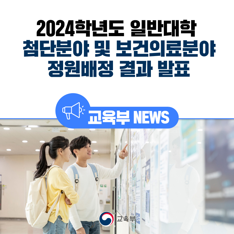교육부(부총리 겸 교육부장관 이주호)는 2024학년도 일반대학 첨단분야 및 보건의료분야 정원조정 결과를 확정하여 각 대학에 통보한다고 밝혔다.