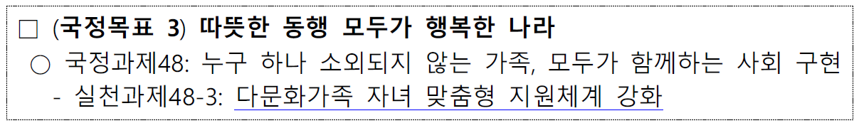 이번 제4차 다문화가족정책 기본계획(2023~2027)은 ‘누구 하나 소외되지 않는 가족, 모두가 함께하는 사회 구현’이라는 윤석열 정부의 국정과제를 뒷받침할 수 있는 다문화가족정책의 추진방향을 제시하였다.