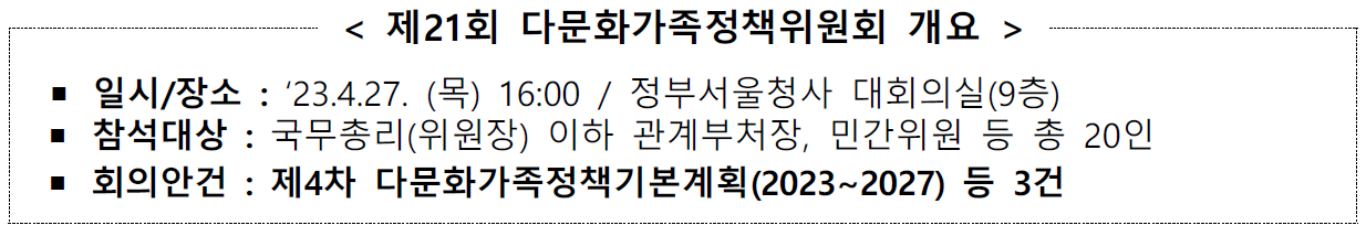 정부는 4월 27일(목) 오후, 한덕수 국무총리 주재로 제21차 다문화가족정책위원회(위원장 : 국무총리)를 개최하여 「제4차 다문화가족정책 기본계획(2023~2027)」을 심의·의결하였다.