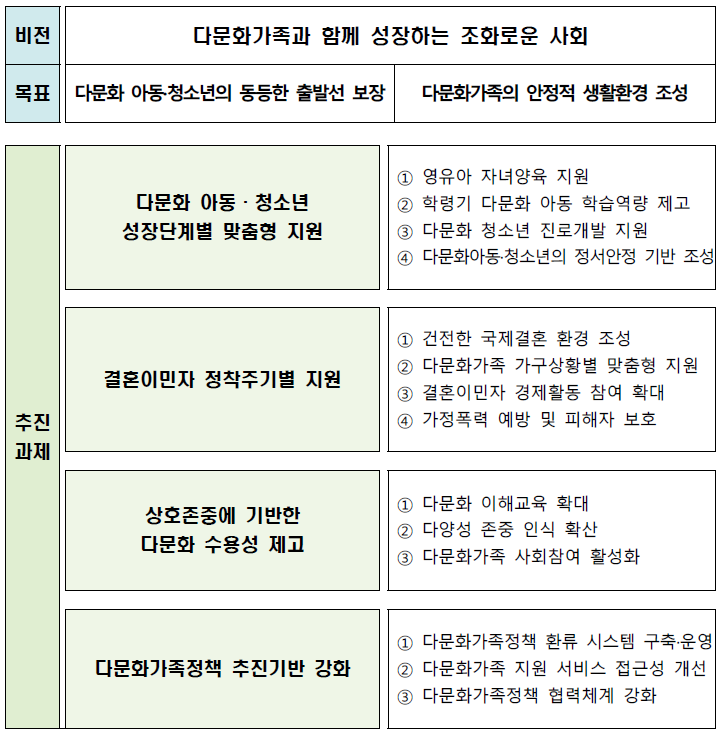 아울러 다문화 아동·청소년의 증가, 결혼이민자의 정착주기 다양화 등 변화하는 정책 환경과 지원수요에 체계적으로 대응하고자 하였다.