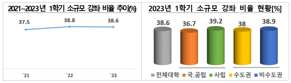 2023년 1학기 20명 이하 소규모 강좌 비율은 38.6%로 2022년 1학기(38.8%)보다 0.2%p 감소했다.