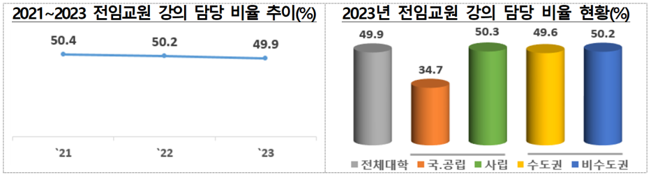 2023년 1학기 전임교원 강의 담당 비율은 49.9%로 2022년 1학기(50.2%)보다 0.3%p 하락하였다.