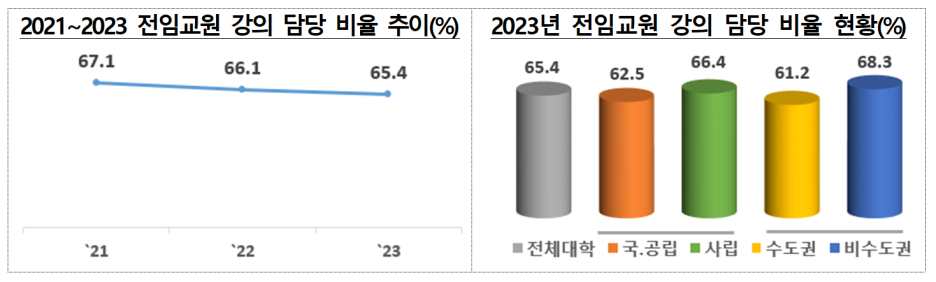 소재지별*로는 비수도권 대학의 전임교원 강의 담당 비율이 68.3%로, 수도권 대학(61.2%)보다 7.1%p 높았다.