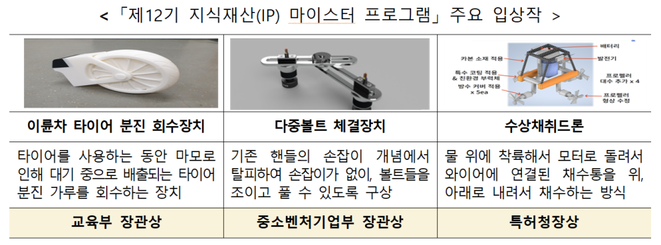‘지식재산 마이스터 프로그램’은 특성화고·산업수요맞춤형고(마이스터고) 학생들의 참신한 아이디어를 발굴하여, 특허 출원부터 시제품 제작까지 지원하는 사업으로 2011년부터 매년 개최되고 있다. 직업계고 학생들은 프로그램을 통해 자신의 기발한 아이디어를 구체화·고도화하여, 해당 기술을 특허로 보호받고, 사업 아이템으로까지 활용하는 과정을 직접 체험하게 된다.