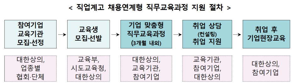 '직업계고 채용연계형 직무교육과정 지원사업'은 교육부가 대한상공회의소(회장 최태원)와 함께 고졸 취업희망자를 대상으로 기업 맞춤형 직무교육과정을 운영하여 기술인재의 직무능력을 높이고 채용 연계 및 기업 적응을 통합 지원하는 사업으로서, 2022년 처음 도입되어 참여 학생들의 만족도가 매우 높았으며 올해는 사업 규모를 300명 이상 확대하였다.
