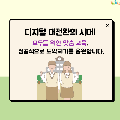 저는 과거에 교사가 학생 개개인의 학습력에 따라 맞춤 지도하는 것은 이상적인 모습으로만 생각했습니다. 디지털 대전환 시대를 맞이하며 교육 분야에서 모두를 위한 맞춤 교육을 선언함에 따라 그 이상이 현실로 다가오고 있는 것을 느꼈고, 앞으로 달라질 교육 현장의 모습을 기대하며 모두를 위한 맞춤 교육, 성공적으로 도약하기를 응원하며 마칩니다.