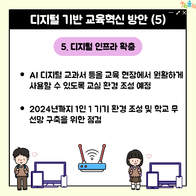 AI 디지털 교과서 등을 활용하여 원활한 디지털 기반 교육을 실현하기 위해서는 교육 현장에 이와 관련한 기본적인 요건들이 미리 갖추어져 있어야 할 텐데요. 이를 위해 2025년 AI 디지털 교과서 본격 적용 시까지 1인 1기기 환경이 조성될 수 있도록 디지털 인프라 환경을 지속 점검 및 지원할 예정이며, 학교 무선망 구축을 위한 점검이 이루어진다고 합니다.