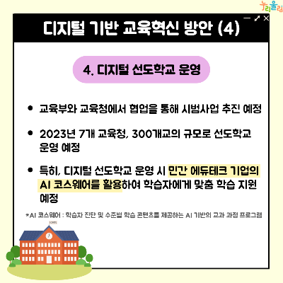 특히, 디지털 선도학교 운영 시 민간 에듀테크 기업의 AI 코스웨어를 활용하여 학습자에게 맞춤 학습을 지원할 계획이며, 정규교과 외에도 늘봄학교・방과후학교 등에서 적극 활용할 예정입니다.
