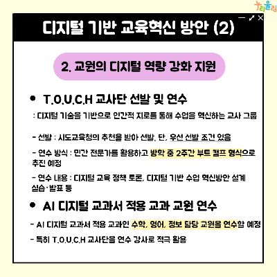 또한 수학, 영어, 정보 등 AI 디지털 교과서 적용 교과 교원 연수도 추진합니다. T.O.U.C.H 교사단을 연수 강사로 적극적으로 활용하고, 민간 에듀테크 기업의 연수 프로그램과 연계하는 등 다양한 연수방식을 활용한다고 합니다.