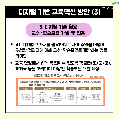 교육 현장에서 교사가 AI 디지털 교과서 등을 쉽게 적용할 수 있도록 학교급(초/중/고), 교과목 등을 고려하여 다양한 교수·학습모델을 개발하고 이를 교육 현장에 보급하기 위해 한국교육개발원을 디지털교육지원센터로 지정하여 운영할 예정입니다.