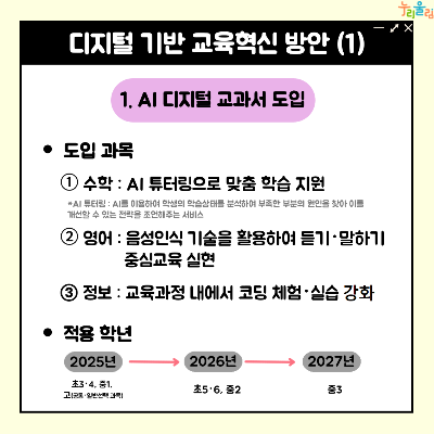 인공지능(AI) 기반 디지털 교과서 도입은 디지털 교육혁신의 핵심 과제입니다. 수학, 영어, 정보 세 개 교과에 우선 도입할 예정이며 적용 학년은 단계적으로 추진할 계획이라고 합니다.