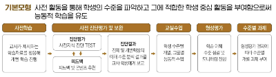 위 교수・학습 방법은 기본모형에 해당합니다. 사전학습을 통해 학생의 수준을 파악하고 그에 적합한 학생 중심 활동을 부여하여 학습자의 능동적인 학습을 유도합니다. 또한, 디지털 기기 과몰입・과의존 방지를 위한 교수·학습을 지원합니다. 교실에서 디지털 기기가 필요한 경우 교사의 지도하에 활용하도록 하며, 올바른 디지털 기기 사용 지도 방법에 관한 교원 연수를 지원할 예정입니다.