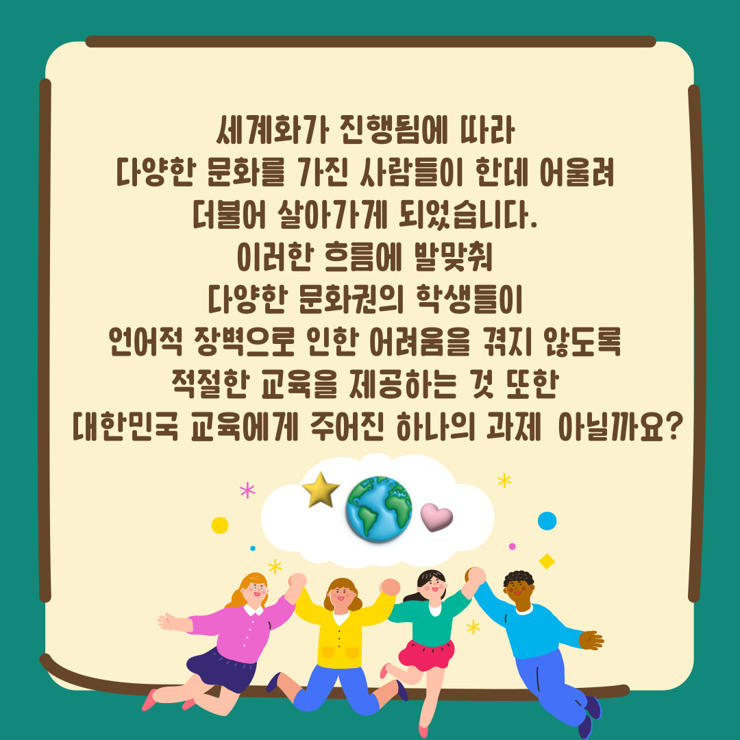 세계화가 진행됨에 따라 다양한 문화를 가진 사람들이 더불어 살아가고 있습니다. 이러한 흐름에 발맞춰 다양한 문화권의 학생들이 한국에서 언어적 장벽으로 인한 어려움을 겪지 않도록 적절한 교육을 제공하는 것 또한 대한민국 교육에 주어진 하나의 과제로 보입니다.