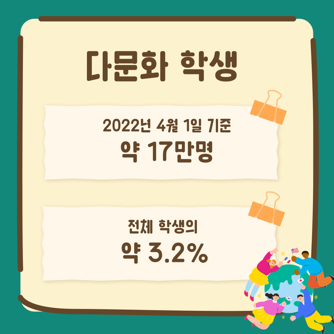 한국 학교에 다니는 다문화 학생들도 점차 늘어나고 있는데요. 교육통계서비스 자료에 따르면 2022년 4월 1일 기준 다문화 학생 수는 약 17만 명에 달했다고 합니다. 2017년에 약 11만 명이었던 다문화 학생 수가 5년 만에 약 6만 명이 증가했습니다.