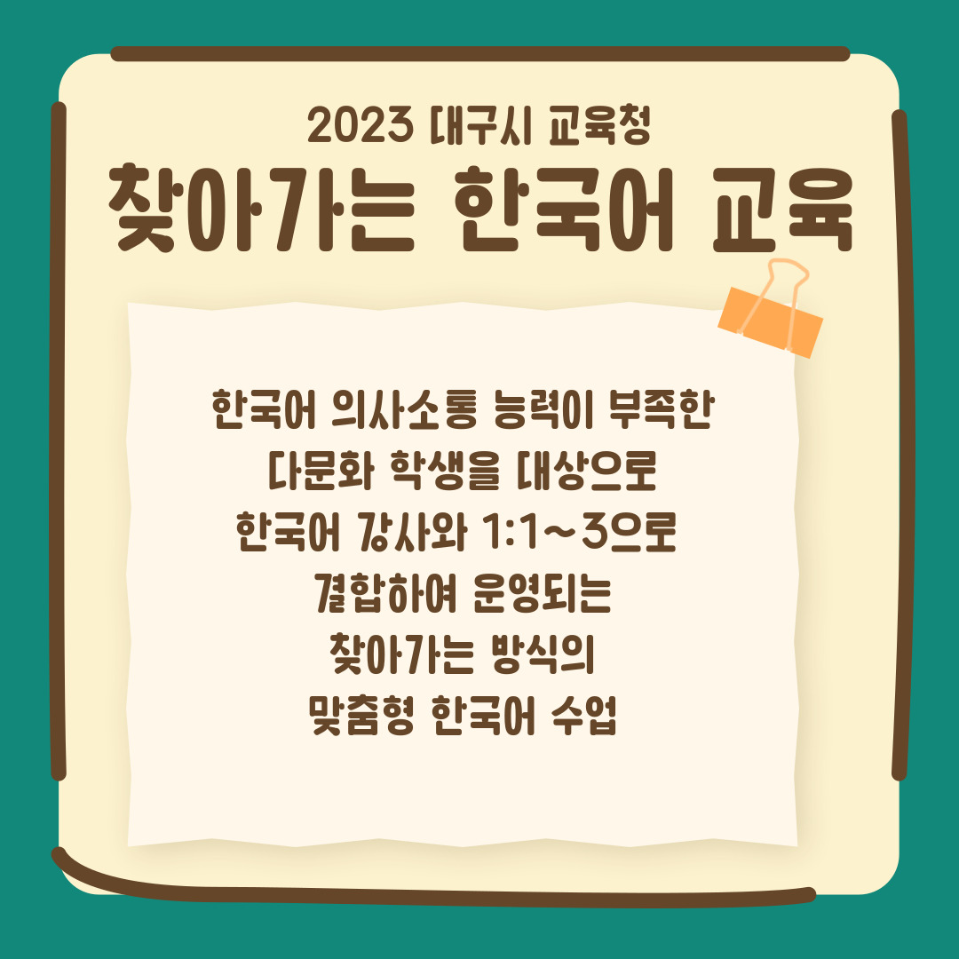 2023년 대구시 교육청은 한국어 의사소통 능력의 부족으로 교육 현장에서 어려움을 겪는 다문화 학생을 위해 2023 찾아가는 한국어 교육을 운영하고 있다고 합니다. 한국어 의사소통 능력이 부족한 다문화 학생을 대상으로 운영되는 맞춤형 한국어 수업입니다.