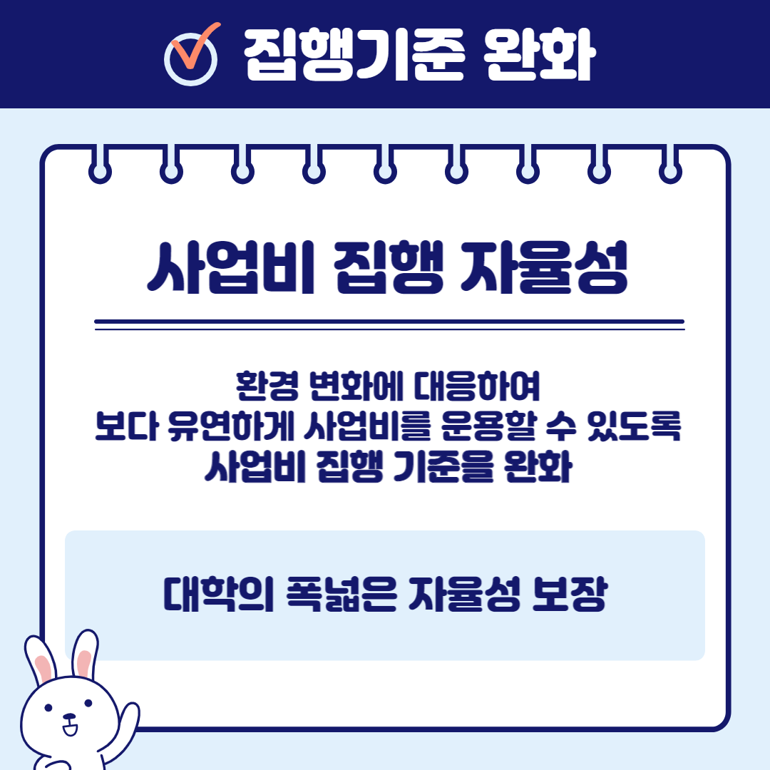 대학이 학령인구 감소, 공공요금 인상 등 환경 변화에 대응하여 더욱 유연하게 사업비를 운용할 수 있도록 사업비 집행기준을 완화하여 대학의 폭넓은 자율성을 보장하는데요. 대학·전문대학 혁신지원사업은 교육혁신을 위한 학생지원 영역의 사업비를 우선 편성합니다. 이 외 대학이 필요로 하는 인건비 및 그 밖의 사업 운영경비는 총액 한도 내에서 자유롭게 편성할 수 있도록 하여 대학의 자율성을 보장합니다.
