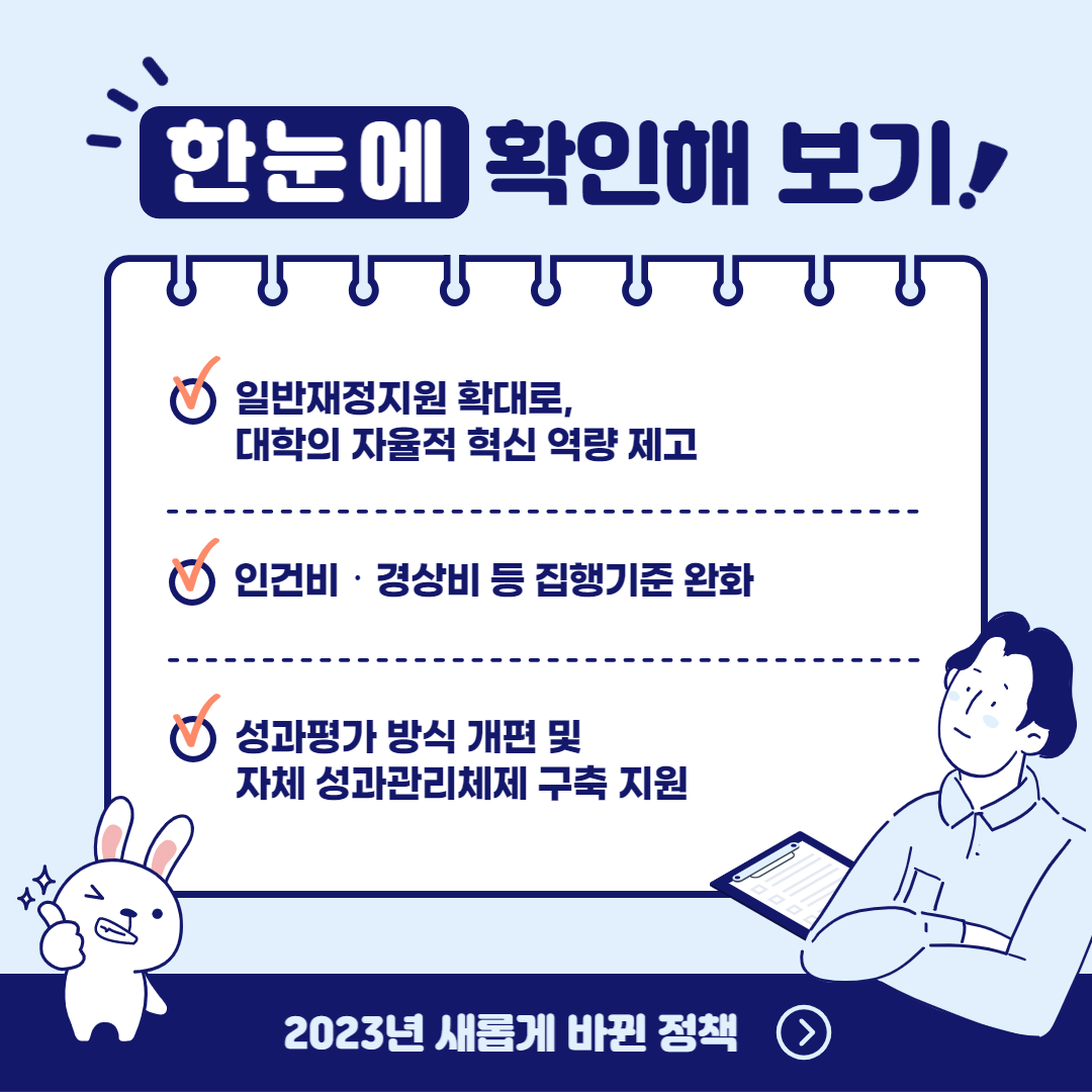지난 3월 교육부는 ‘2023년 대학·전문대학 혁신지원사업 및 국립대학 육성사업 기본계획’을 발표했습니다. 사업비 집행기준 완화와 성과평가 방식 개편을 통해 대학의 자율성을 확대했습니다. 또한, 재정 지원을 대폭 상승시켜 대학이 자율 혁신과 미래 경쟁력 강화를 추진할 수 있도록 지원을 이어 나가는데요. 그럼 자세한 내용을 살펴볼까요?