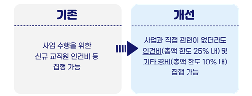 아울러, 국립대학 육성사업도 사업비 집행기준을 우선 허용(네거티브) 방식으로 개선하였습니다. 최근 공공요금 인상 등에 따른 대학의 재정난을 고려하여 공과금 등 경상비성 경비를 포함하여 그 밖의 사업 운영경비를 20% 한도 내에서 집행할 수 있도록 허용합니다.