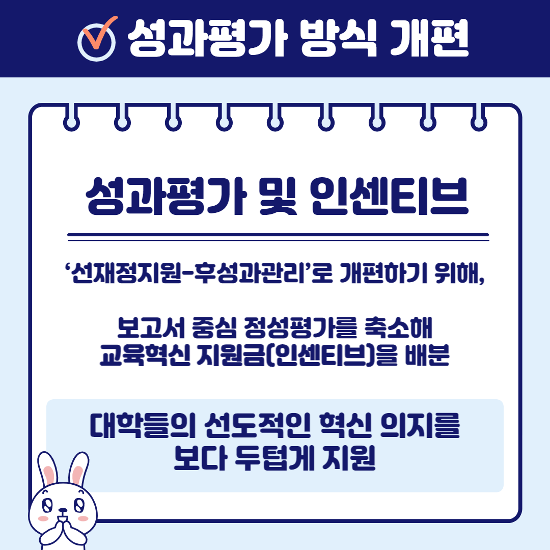 마지막으로 교육부는 선(先)재정지원-후(後)성과관리 방식으로 개편하기 위해, 보고서 중심의 대면 및 정성평가를 축소하고 핵심적인 사항을 중심으로 평가하여 교육혁신 지원금(인센티브)을 배분할 계획입니다.