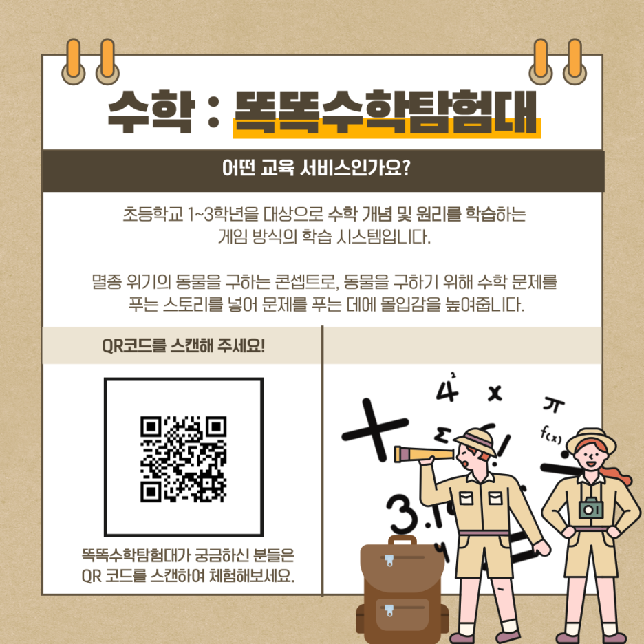 똑똑! 수학탐험대는 초등학교 1~4학년 학생을 대상으로 수학 개념 및 원리를 학습하는 AI 활용 초등수학 수업 지원 시스템입니다. 프로그램 중에 흥미로운 활동이 있었는데요. 바로 수학 탐험대라는 이름에 맞게 전 세계를 탐험하며 멸종 위기에 있는 동물을 구하는 활동입니다.