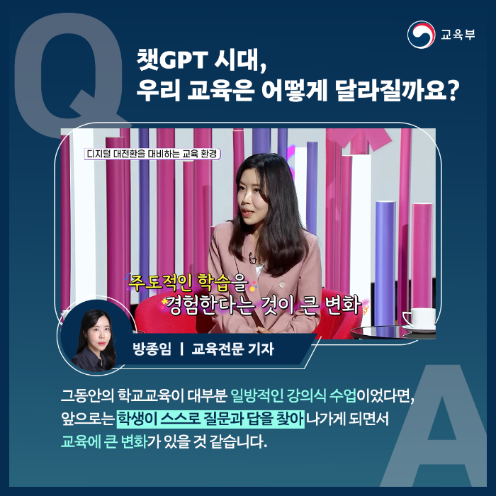 그동안의 학교교육이 대부분 일방적인 강의식 수업이었다면, 앞으로는 학생이 스스로 질문과 답을 찾아 나가게 되면서 교육에 큰 변화가 있을 것 같습니다.