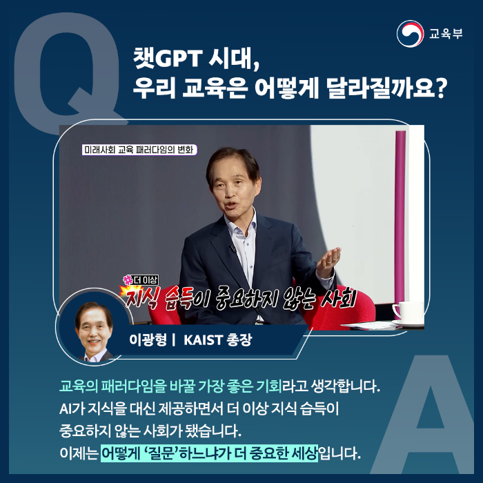 교육의 패러다임을 바꿀 가장 좋은 기회라고 생각합니다. AI가 지식을 대신 제공하면서 이젠 더 이상 지식 습득이 중요하지 않는 사회가 됐습니다. 이제는 어떻게 ‘질문’하느냐가 더 중요한 세상입니다.